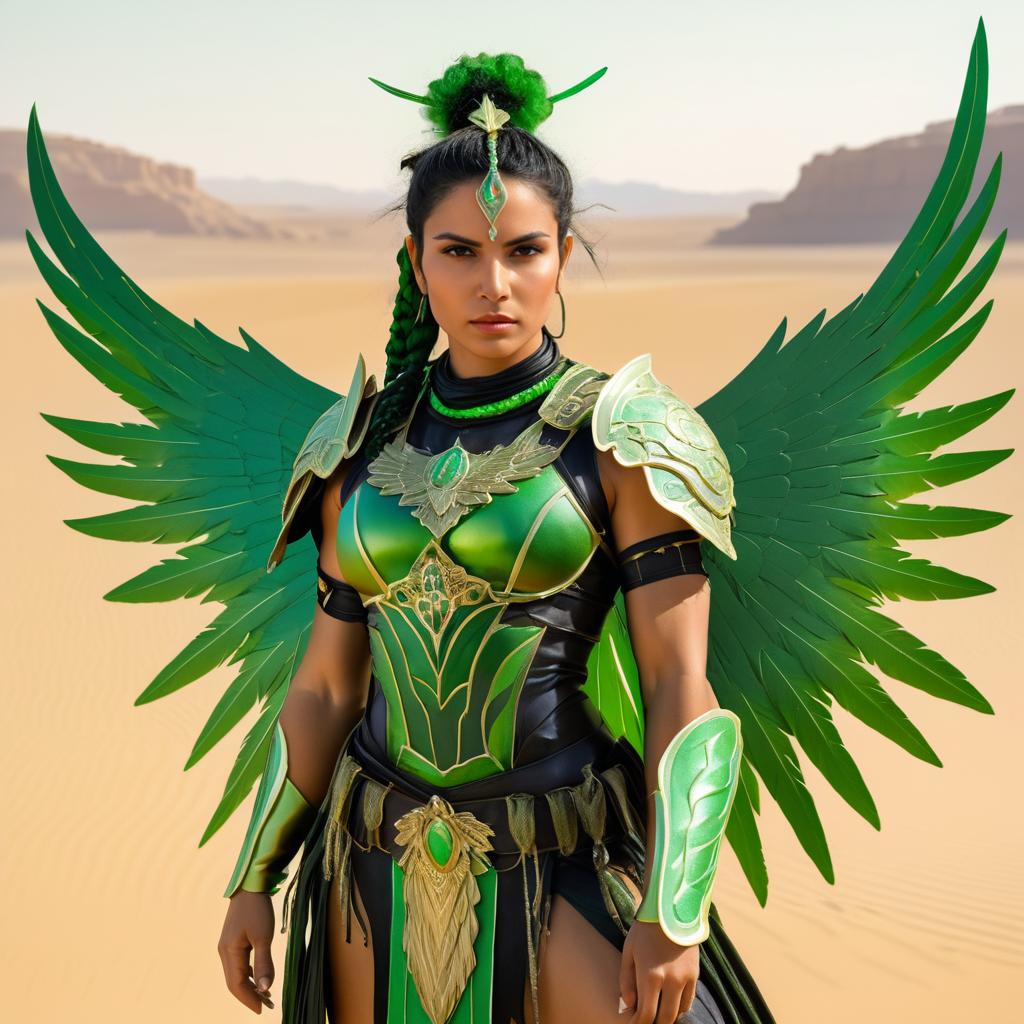 Fantasy Warrior Woman with Green Armor and Wings in Desert
