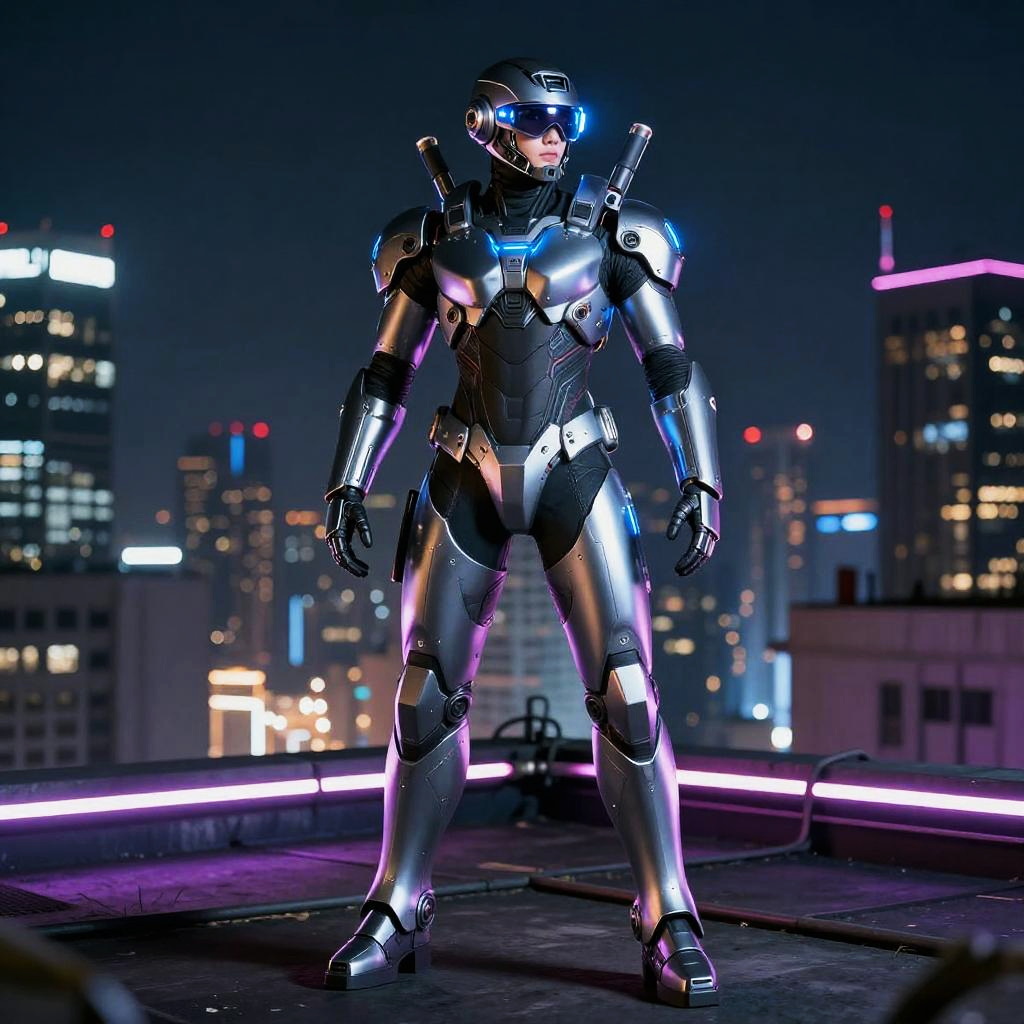 Combat futuristic sleek high tech futuristic armor standing on a neon-lit rooftop during nighttime, combining metallic sheen with smart fabric textures, equipped with jet boosters and augmented reality visors, against a sprawling metropolis skyline.