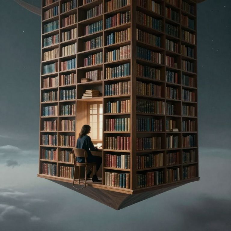 Suspended in an ethereal void, a gravity-defying library cradles infinite knowledge, where thoughts materialize into tomes, inviting solitary contemplation amidst the quiet hum of cosmic whispers.