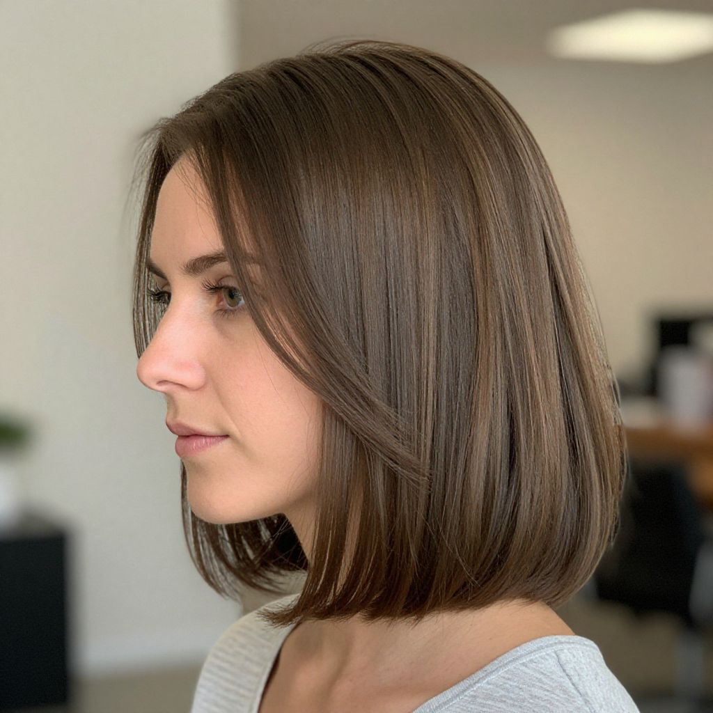 Photograph of a young woman with fair skin and straight, shoulder-length brown hair that has a subtle shine. She is viewed in profile, facing left, with a neutral expression. She wears a white, textured, short-sleeve top. The background is slightly blurred, featuring a light-colored wall and a hint of a desk with a computer monitor and office chair. The lighting is bright and even, highlighting the smooth texture of her hair and the gentle contours of her face.