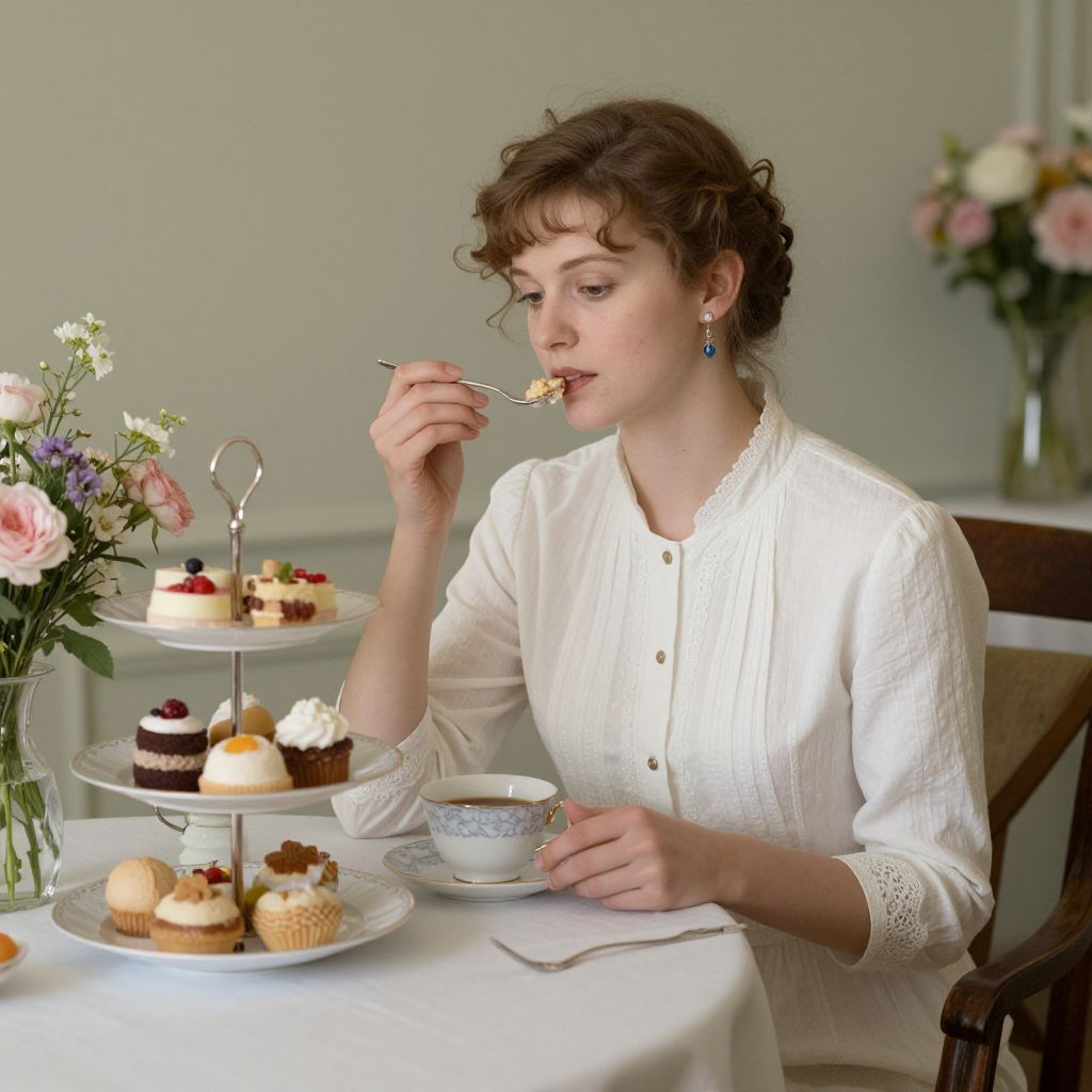Photograph of a fair-skinned woman with short, curly brown hair, wearing a white, buttoned, long-sleeve blouse. She sits at a round table adorned with a white tablecloth, holding a fork to her mouth with a bite of a cupcake topped with cream and cherries. The table displays a three-tiered stand with assorted cupcakes and a plate with more cupcakes. In the background, there's a vase of pink and white flowers on the right, and a blurred floral arrangement on the left. The woman wears blue earrings and focuses on eating, exuding a serene, elegant atmosphere.
