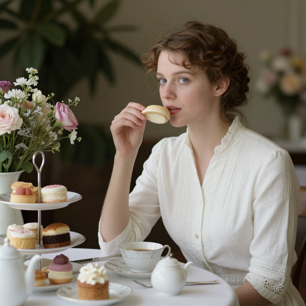 A woman in a vintage-style white blouse enjoys an afternoon tea setting, captured in a detailed realism style reminiscent of William Henry Margetson's work, featuring delicate floral arrangements and soft, natural lighting that enhances the serene and timeless atmosphere.