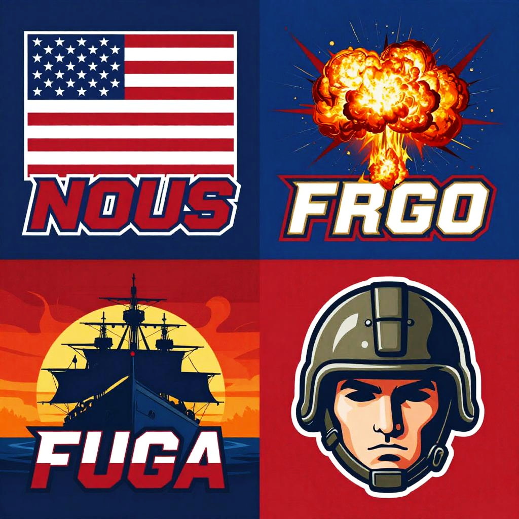 Digital graphic with four quadrants: American flag, explosive fireball, sailing ship at sunset, and helmeted soldier, all labeled "NOUS F
