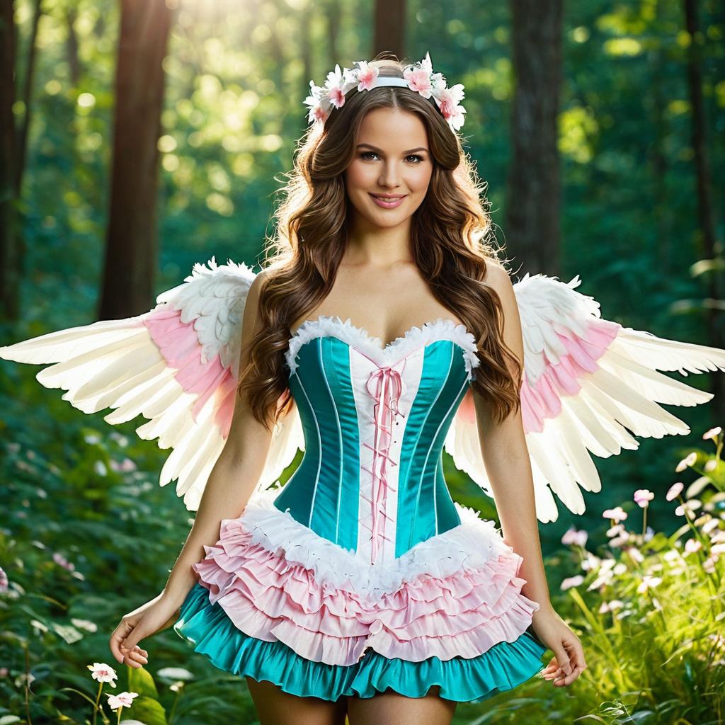 Photorealistic image of a young woman with long brown wavy hair wearing a strapless teal and pink corset dress with multiple pink ruffled layers. She has white feathered angel wings and a headband adorned with small white flowers. The woman stands in a lush green forest with soft sunlight filtering through the trees, smiling gently. The scene conveys a whimsical and enchanting fairy tale atmosphere with detailed feathers and soft fabric textures.