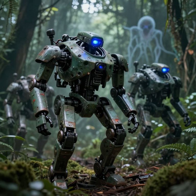Uplight humanoids miltary robots patrol in deep jungle, specter, ultra detailed photography, depth of field, intricately detailed, 35mm, leica m, realistic photography,