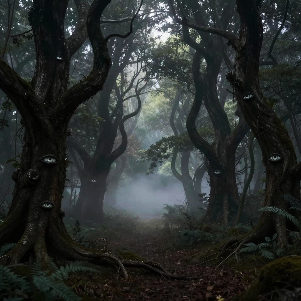 Estranheza illustrated as an eerie forest with twisted trees and glowing eyes peering from the darkness, thick mist rolling over the ground, contrast of shadow and dim light, haunting yet beautiful surreal landscape, intricate detail