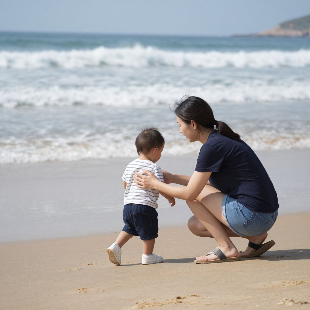 Mother Guiding Toddler on Beach