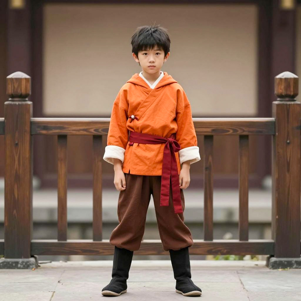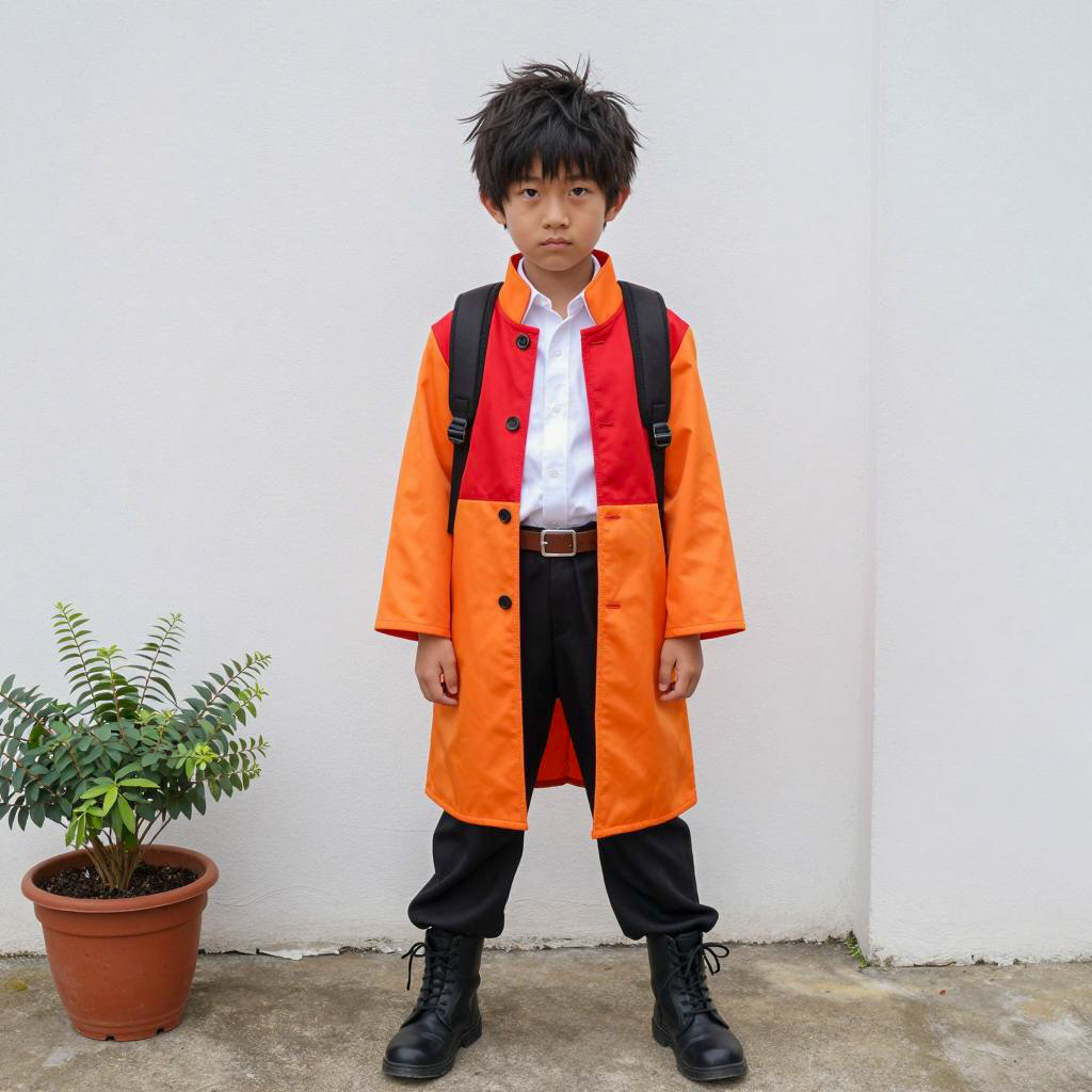 One punch man costume adult, photograph of a young boy, standing outdoors, daytime, bright sunlight, beige wall background, boy wearing red jacket with white circular badge on left chest, black belt, brown pants, black gloves, short brown hair, serious expression, right hand raised with index finger pointing up, full body shot, shadow on ground, concrete floor, minimalistic background, realistic style, clear colors, well-lit, casual attire, standing in center of frame