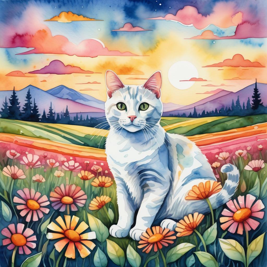 A whimsical watercolor painting of a white cat with light orange patches lying in a vibrant flower field. The cat gazes serenely at a colorful sunset sky filled with soft clouds. The scene features a lush garden with blooming pink and orange flowers and rolling hills in the background, evoking a dreamy and peaceful atmosphere with delicate watercolor texture.