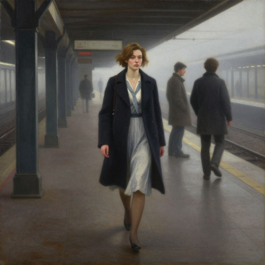 Photograph-style digital artwork of a woman walking alone on a foggy subway platform. She has fair skin, red-brown curly hair, and wears a dark navy coat over a white blouse and blue-gray patterned dress, paired with black heels. Her expression is neutral. In the background, two men in dark coats and hats walk away, blurred by fog. The platform has black pillars and a yellow safety line near the tracks. Overhead signs and lights create a dim, misty atmosphere. The overall tone is moody and slightly mysterious.