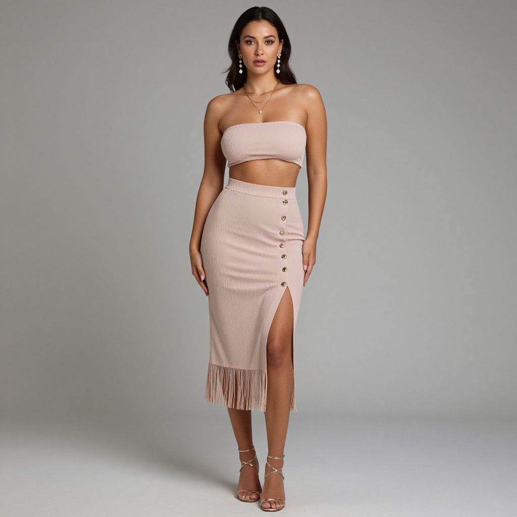 "Woman, contemporary chic, ribbed strapless bandeau top in blush pink, coordinating high-waisted mid-length skirt with button detailing on front leading to a thigh-high slit, fringe hem, pearl earrings, golden layered necklaces, metallic strappy heels, minimalist studio background.. Sexy. Pretty face and beаutiful eyes. Big breasts."