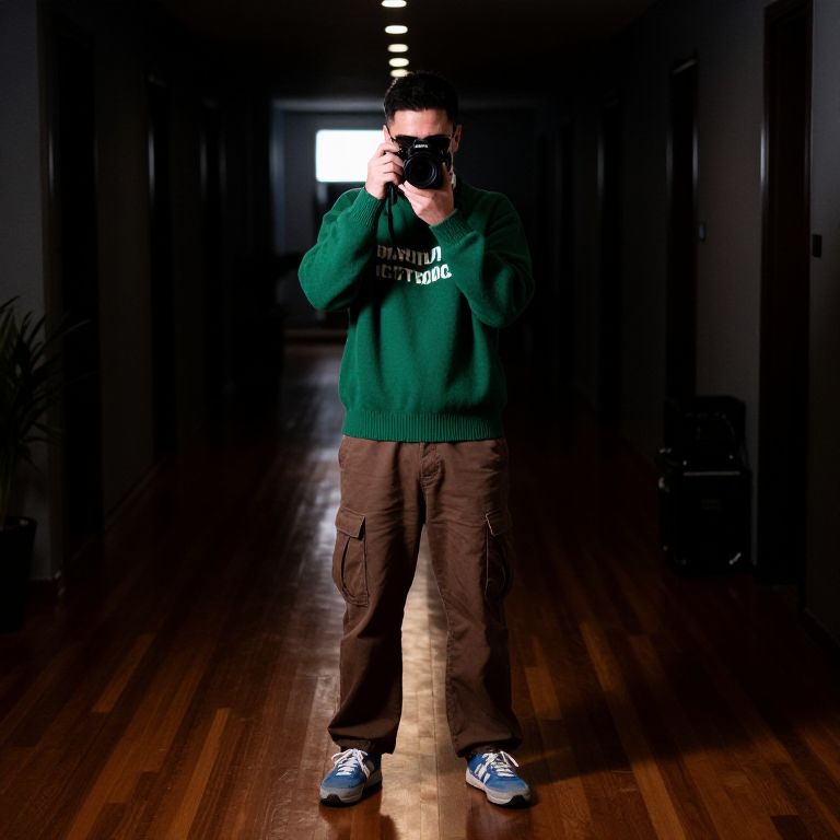 Photograph of a guy standing in a long, dark hallway with shiny wooden floors. He's wearing a green sweater with white text, brown cargo pants, and blue sneakers. He's holding a camera up to his face, wearing dark sunglasses. A bright light source is behind him, making him the focal point. There's a potted plant on the left and some equipment on the right.