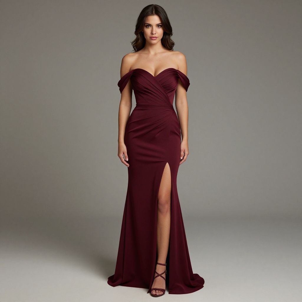 Photograph of a woman with dark hair wearing an off-shoulder, deep burgundy, floor-length gown with a thigh-high slit, standing against