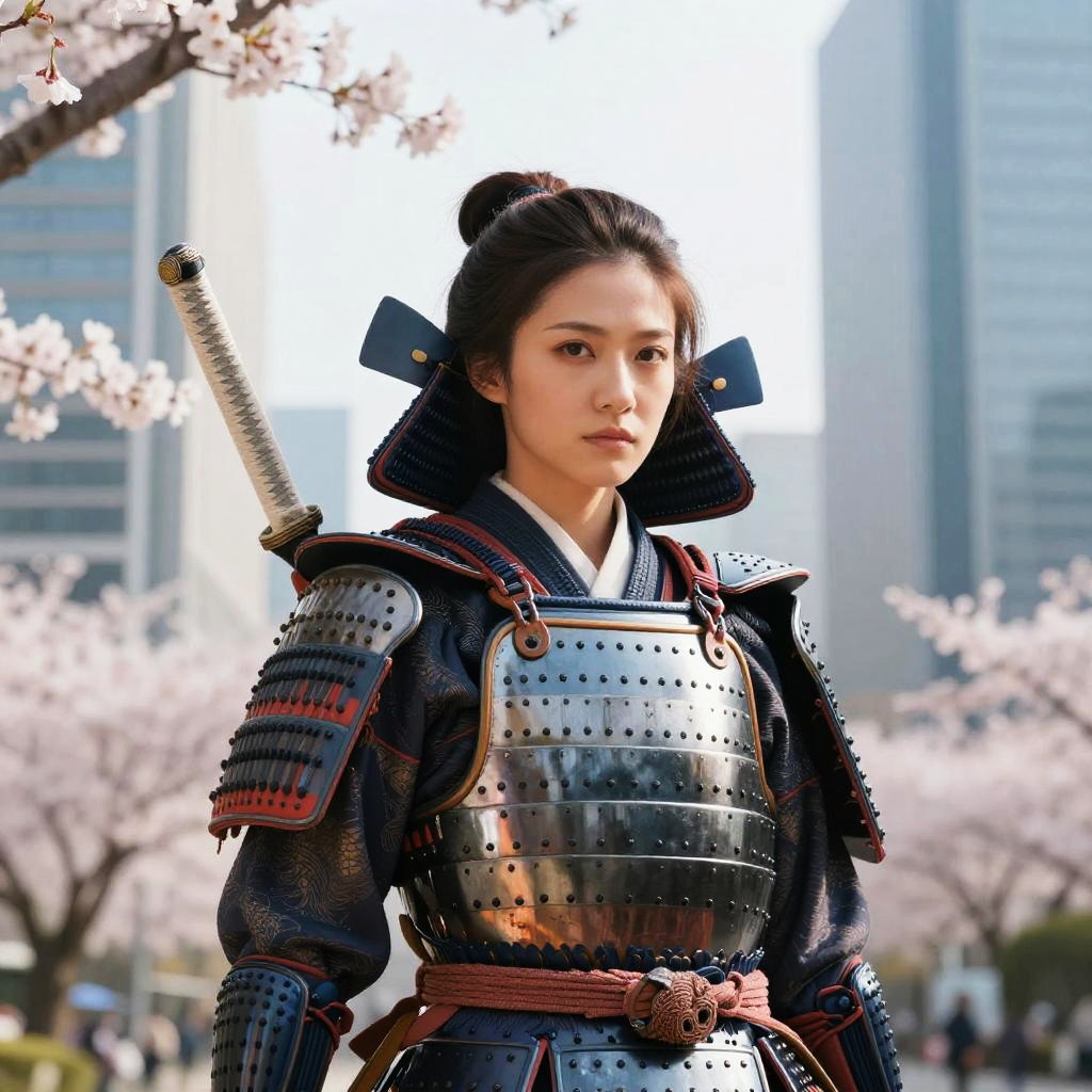 Portrait of a modern female samurai with sleek armor inspired by traditional Japanese designs, urban background with skyscrapers and cherry blossoms, intense focused gaze