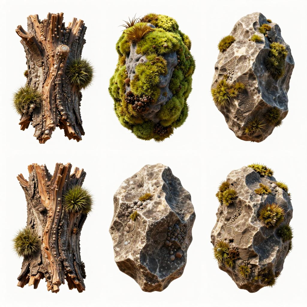 Texture creator application showcasing organic textures like moss, bark, and rock formations, high detail with natural colors, interactive design elements with brush strokes and layered effects, photorealistic nature inspired surface rendering.