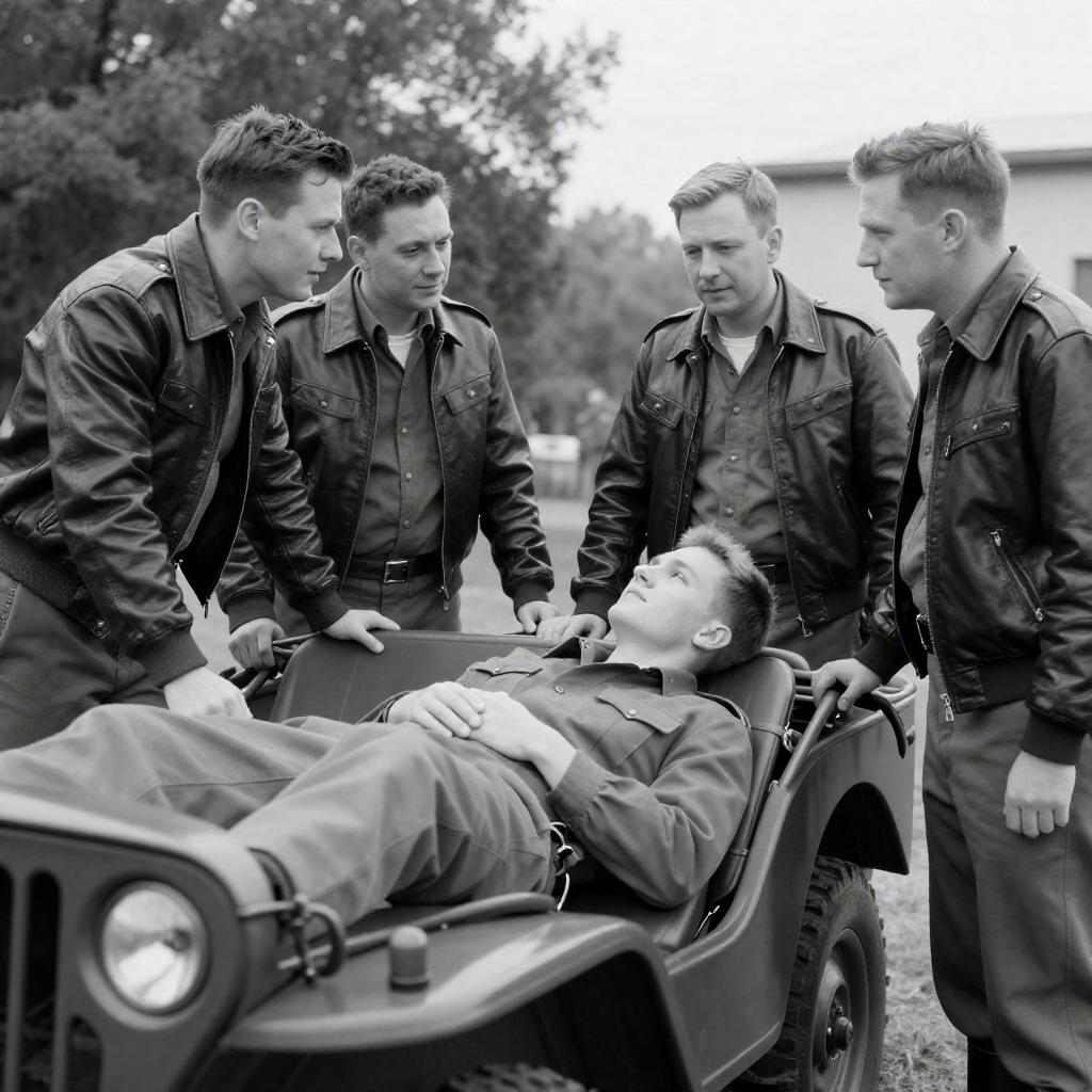 Black-and-white photograph of five men in military uniforms and leather jackets, surrounding a young man lying in the back of a military jeep. The men are engaged in conversation, with one standing on the left leaning forward, and the others standing around the jeep. Background includes trees and a building.