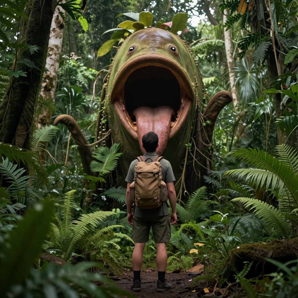 A man with a backpack stands in a lush jungle, facing a giant carnivorous plant with an open mouth.