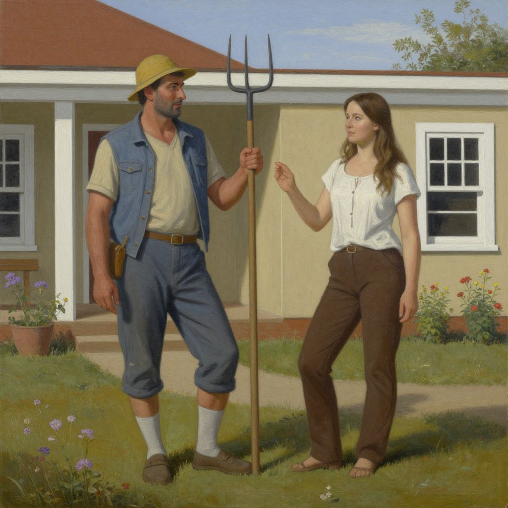 Digital painting of two men in white shirts and brown hats, holding a pitchfork, standing in front of a farmhouse, with a woman in a blue