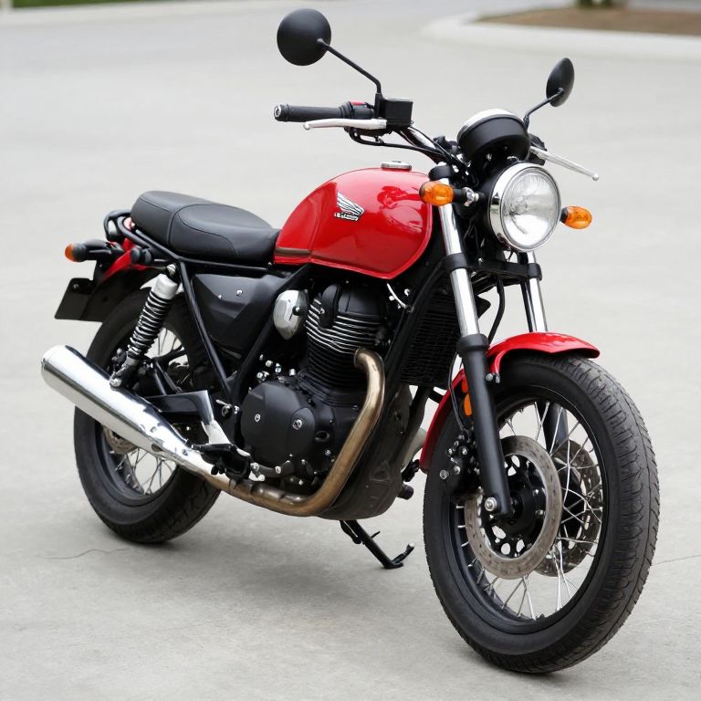 Classic Honda Rebel 250 motorcycle showcasing a vibrant red fuel tank and black accents, featuring a retro design with a round headlight, dual front forks, and a polished chrome exhaust pipe, parked on a smooth concrete surface.