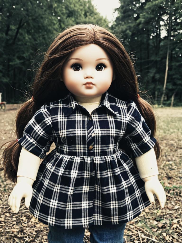 Plus size classic rag doll, 1girl, solo, brown hair, long hair, drill hair, plaid shirt, outdoors, realistic, shirt
