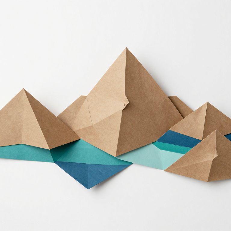 Origami-inspired mountain peaks crafted from textured brown paper rise against a stark white wall, their geometric folds revealing cascading layers of teal and blue hues that mimic hidden valleys and serene lakes.