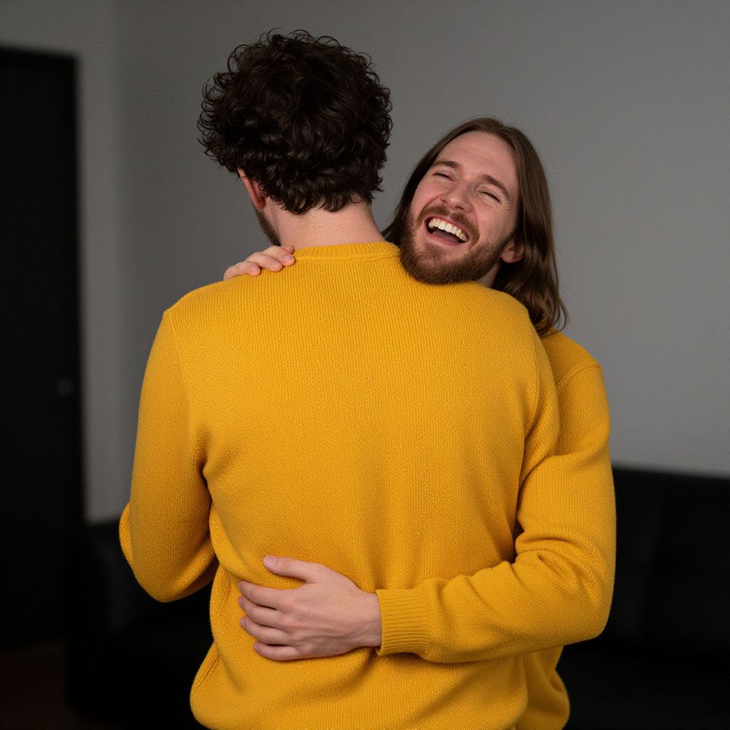 Photograph of two men hugging in a dimly lit room. The man in the foreground, with curly dark hair and his back to the camera, wears a bright yellow knit sweater. The man in the background, with long brown hair and a beard, smiles broadly and also wears a yellow knit sweater. His right hand rests on the other man's back, while his left hand is around his waist. The background is blurred, with a dark door on the left and a gray wall. The overall mood is joyful and affectionate.