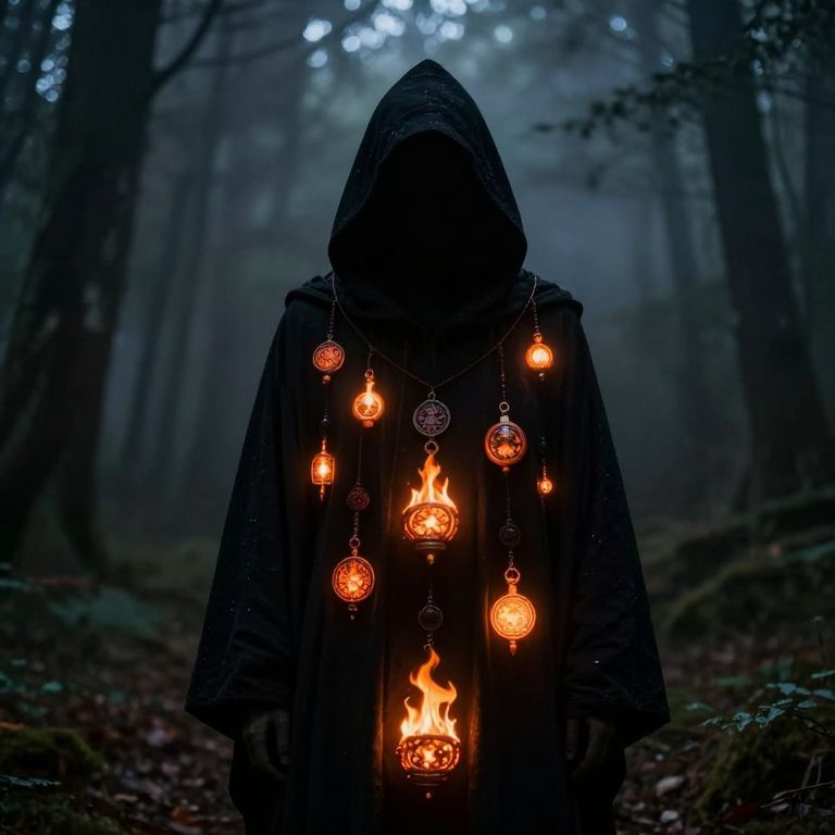 In a dense, misty forest, a figure cloaked in darkness stands as the central focus of the image. The figure is entirely enveloped in a black robe, with a pointed hat casting a shadow over their face, concealing any identifying features. The robe is adorned with a series of glowing, fiery milagro charms and lucky talismans, each emitting a warm, orange glow that contrasts starkly against the deep, somber tones of the robe. The milagro charms are intricately designed, with some resembling small, glowing orbs, while others appear more ornate, with intricate patterns and textures. The spatial arrangement of the charms is varied, with some hanging close to the figure's chest, while others dangle further down the robe, creating a sense of depth and dimension. The overall composition is balanced, with the figure and the glowing charms drawing the viewer's eye into the heart of the image, creating a sense of mystery and intrigue. The interplay of light and shadow, combined with the rich textures of the robe and the glowing charms, creates a visually striking and evocative scene.
