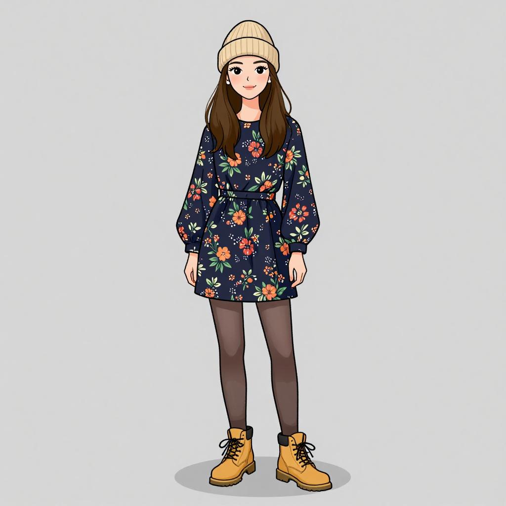 Woman with pretty face and pretty hair. smiling Woman, casual streetwear, floral print mini dress in dark tones, round neckline, long sleeves, gathered at waist, above-knee length, beige knitted beanie, sheer black tights, mustard yellow lace-up ankle boots, plain gray studio background. --sref 1467