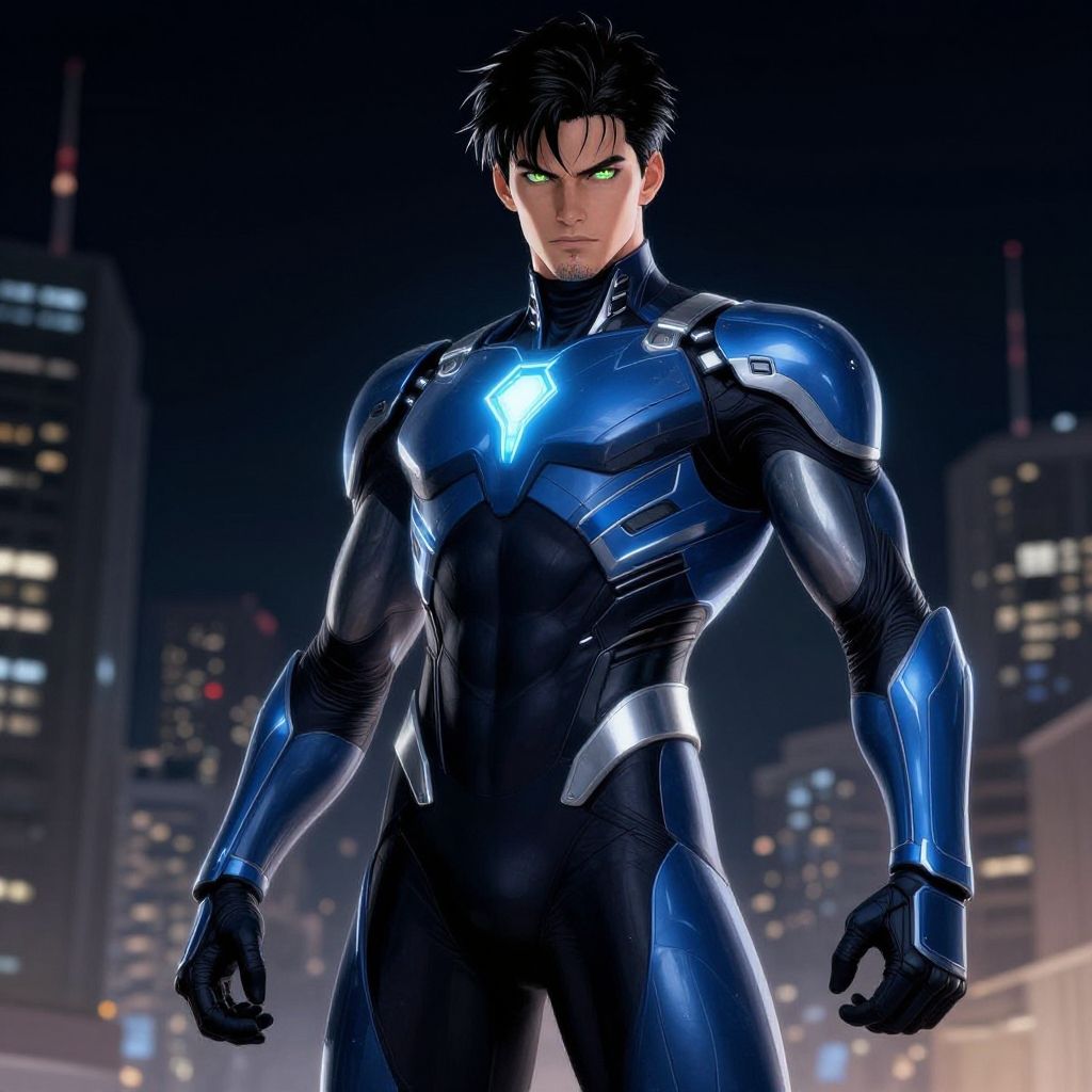 CGI image of a muscular, handsome man with sharp green eyes, wearing a sleek, black and blue futuristic armored suit with a glowing blue chest emblem. His short, black hair is slightly messy. He stands confidently in a nighttime cityscape with blurred skyscrapers illuminated by streetlights and building lights in the background. The suit has a shiny, metallic texture, accentuating his defined muscles. The overall style is reminiscent of comic book or superhero art, with a high contrast between the dark suit and the bright city lights. The man's expression is intense and determined.