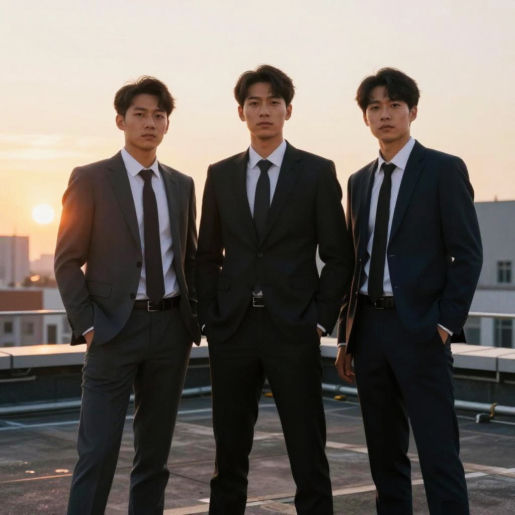 Three men in suits standing confidently on a city rooftop at sunset, cinematic lighting, ultra realistic, sharp details, 8k