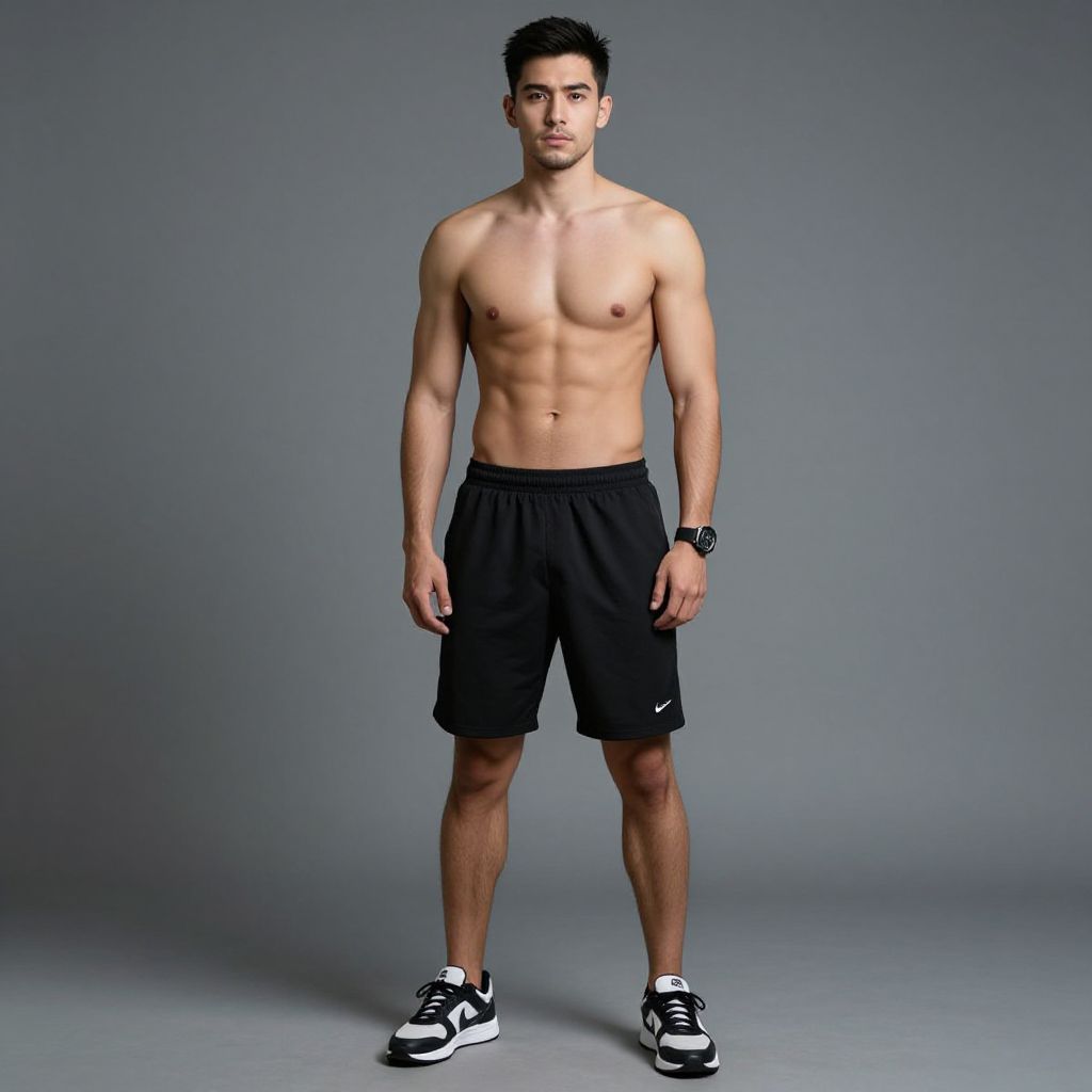 Photorealistic CGI image of a shirtless, muscular young man with short black hair, wearing black jeans, standing barefoot against a white background.