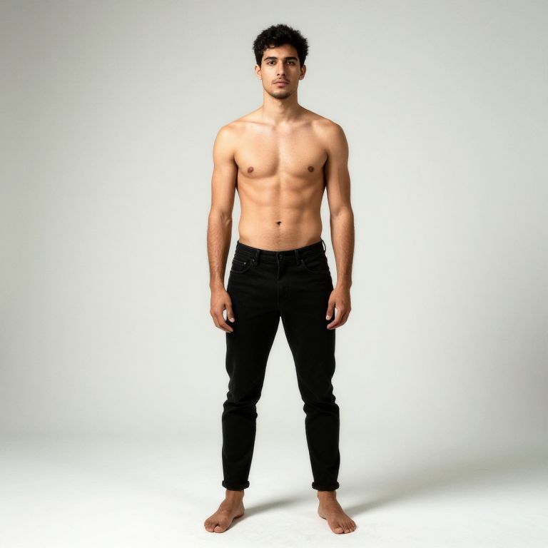 A digital CGI image of a young, shirtless man with a medium build and light brown skin. He has short, curly black hair and stands facing forward with a neutral expression. He is wearing black, slightly fitted jeans and is barefoot. His chest is smooth, and his nipples are small. The background is a simple, gradient white to light gray, emphasizing his figure. The lighting is even, highlighting his muscular definition and skin tone. The overall style is realistic with a slight cartoonish quality due to the clean, simplistic background and exaggerated proportions.