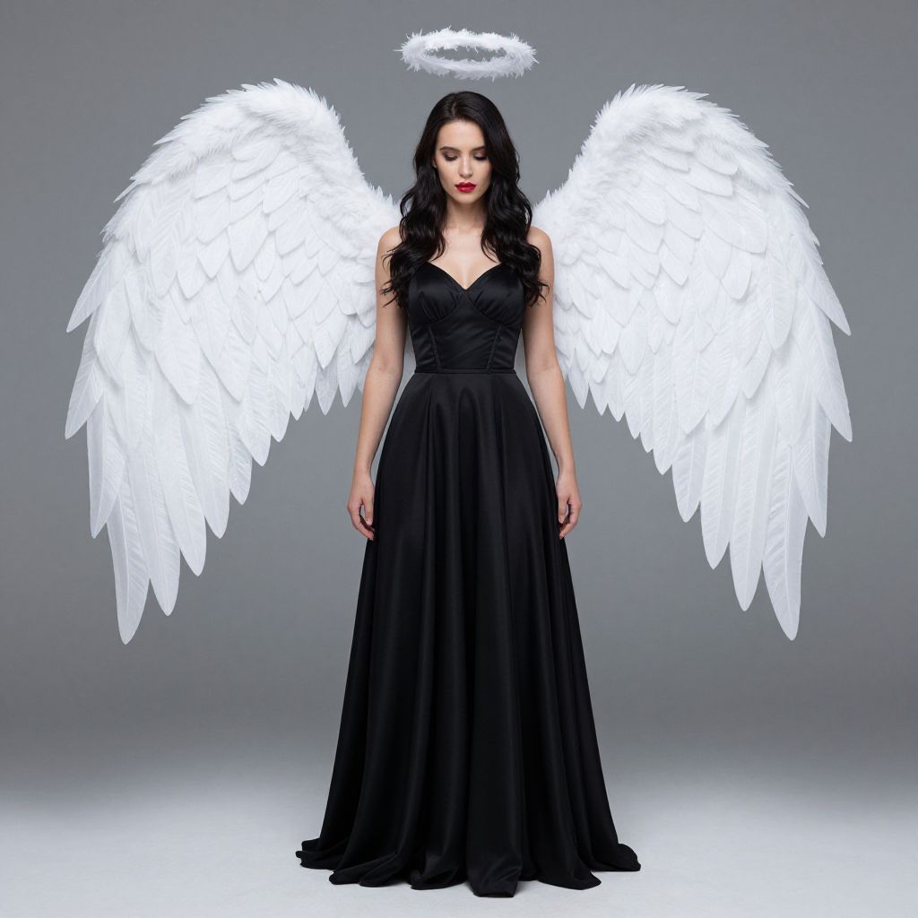 Photograph of a pale-skinned woman with long, wavy black hair, wearing a sleeveless, black, V-neck gown that falls to the floor. She has large, white, feathered angel wings extending from her back and a glowing white halo above her head. Her eyes are closed, and she stands against a plain gray background. The white feathers contrast sharply with her dark dress and hair, creating a striking visual effect. The halo and wings give her an ethereal, heavenly appearance.