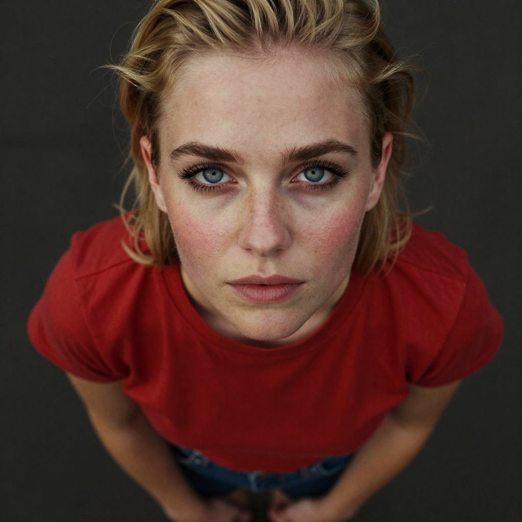 Close-up frontal portrait of a blonde woman with blue eyes wearing a red shirt and cropped pants, taken from a high angle. The image highlights detailed facial features including mascara, light freckles, skin blemishes, moles, textured and slightly shiny skin with visible pores and blush. The background is dark and muted, emphasizing the subject's intense gaze and natural skin details.