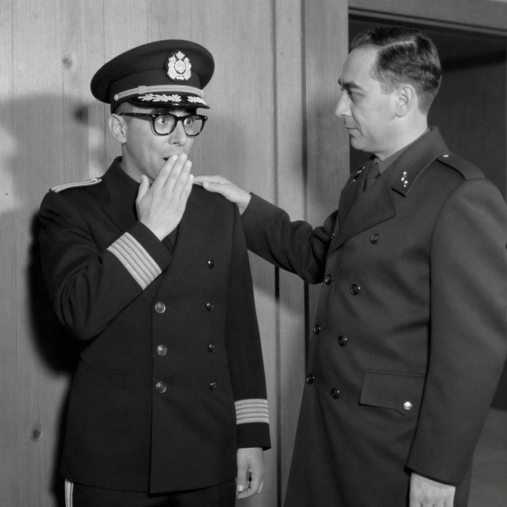 Black-and-white photograph of two men. One in a naval uniform with a peaked cap and glasses, standing against a wooden wall, covering his mouth. The other in a dark double-breasted military coat, placing his hand on the first man's shoulder. Both men have short, dark hair. Background includes wooden structure and shadows. The first man looks surprised, the second man has a neutral expression.