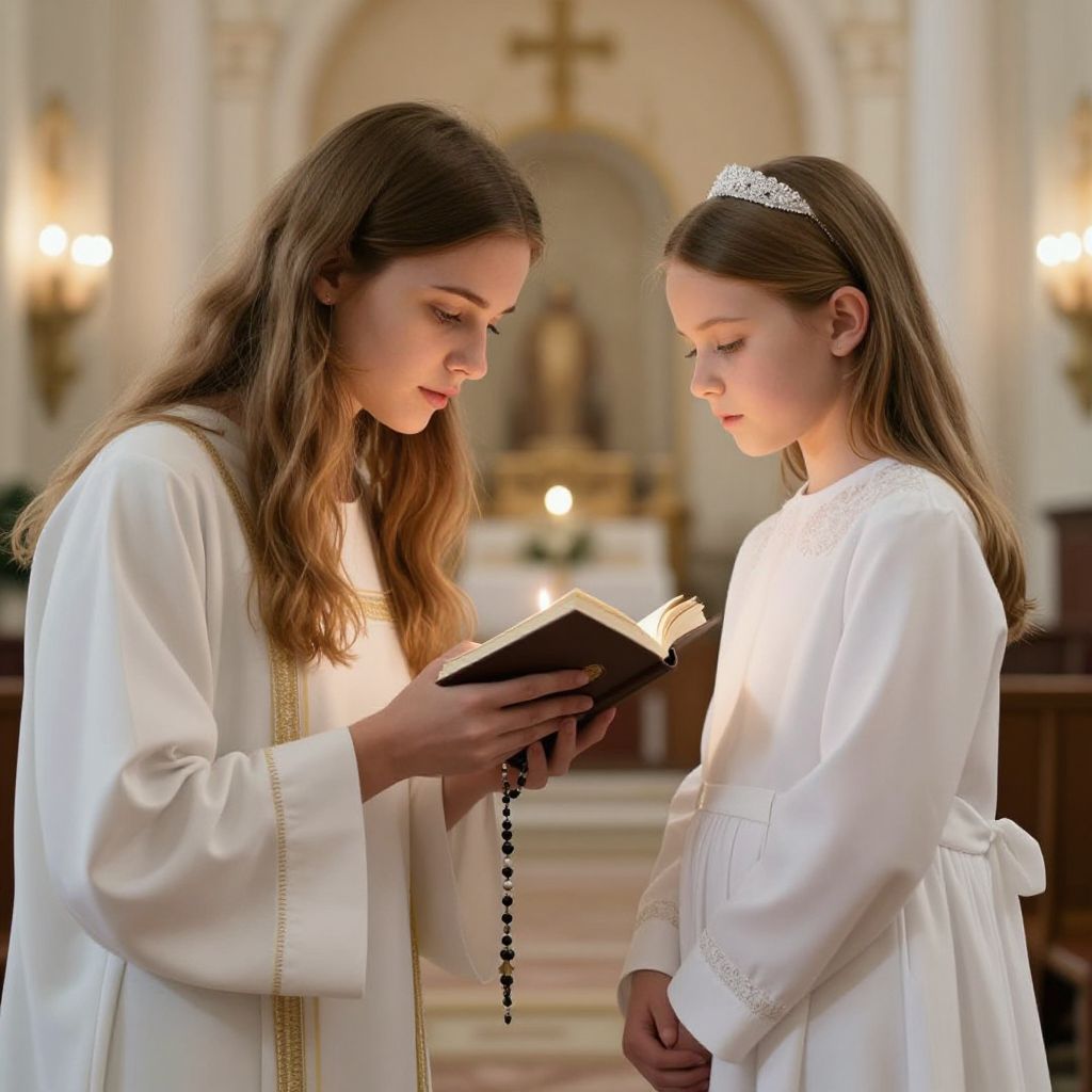 In a tender moment of spiritual guidance, a young woman shares the sacred weight of faith through a rosary and prayer book, igniting a spark of hope and reverence in the heart of a girl adorned in her first holy communion dress, as the air hums with the quiet promise of eternal connection.