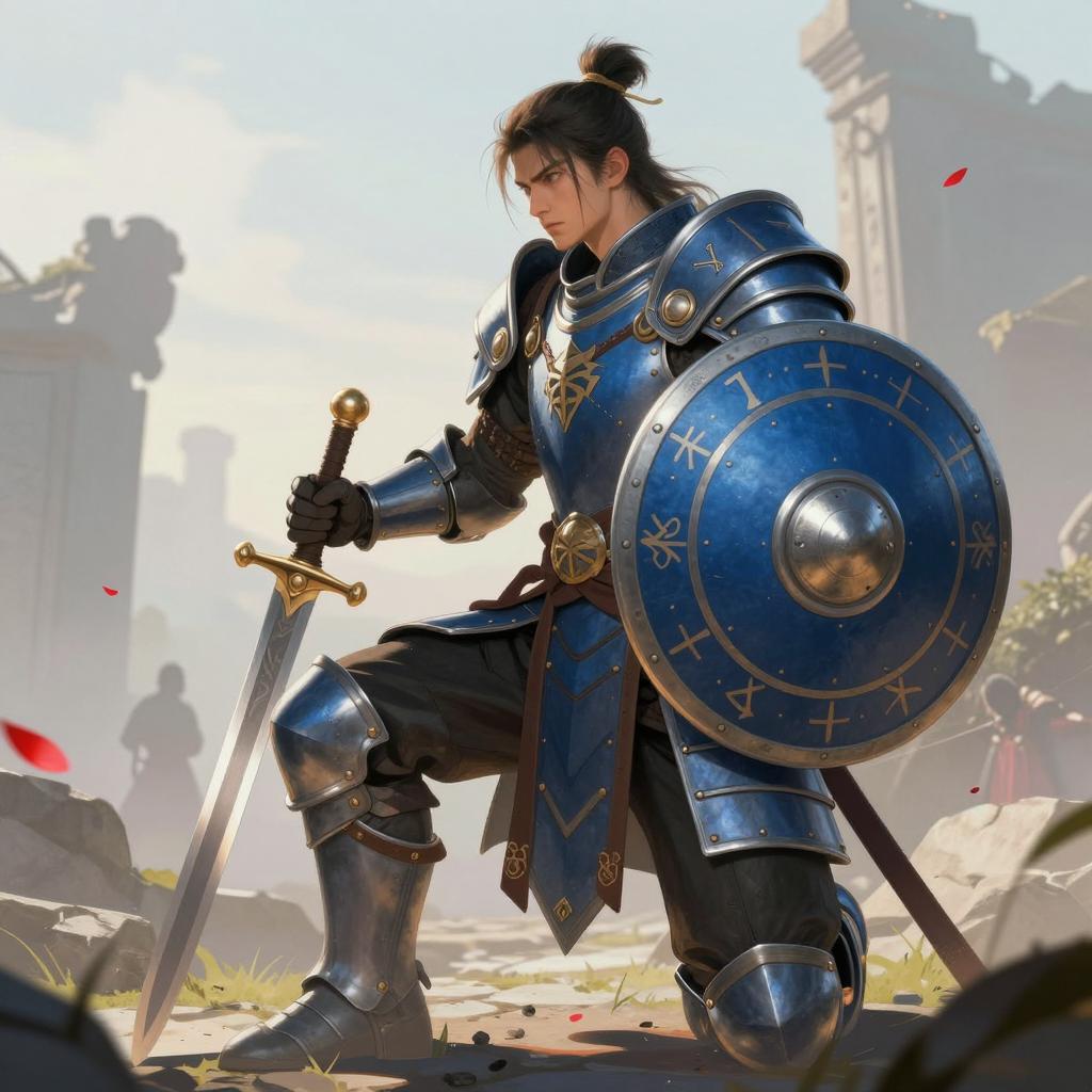 Male warrior crouching, holding a large round shield with blue and white markings in his right hand, and a long sword in his left hand. He has short black hair, a beard, and wears blue armor with shoulder guards, a leather belt, and grey boots. His expression is focused. The background is a bright, overexposed white. Dust is visible around his feet. The warrior is positioned on the right side of the image.