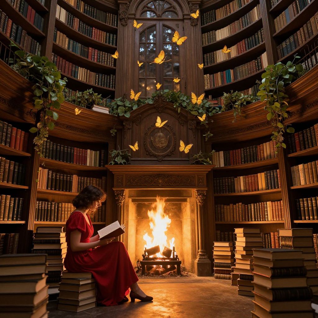 Photograph of a library with tall, wooden bookshelves filled with colorful books, arranged symmetrically around a large, lit fireplace at the center. A woman with short, curly hair, wearing a red dress, sits on a stack of books to the left, reading a book. Golden butterflies flutter around her, and green vines adorn the shelves. The warm, orange glow of the fireplace contrasts with the dark wood and books. The setting is cozy and magical, with an arch window above the fireplace, adding a touch of elegance.