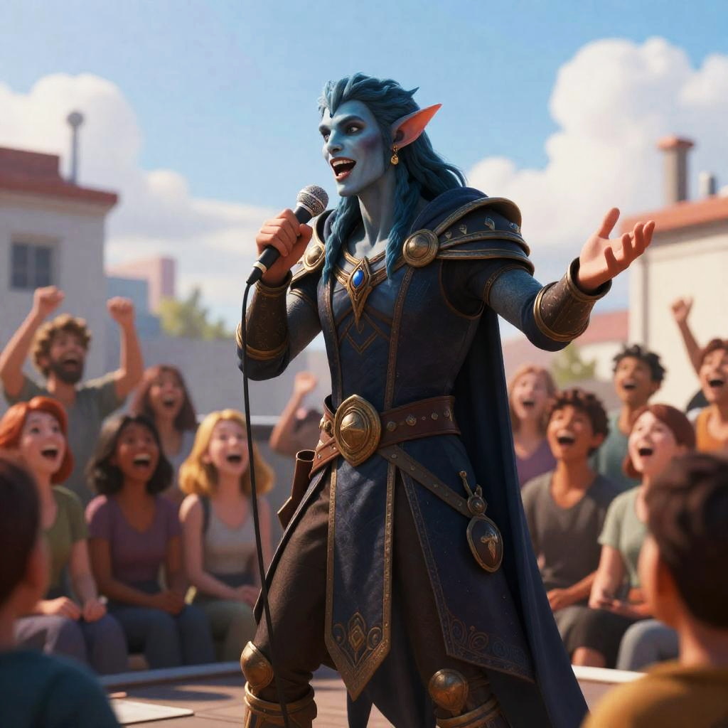 Realistic photo.D&D-style illustration of a charismatic aasimar, speaking into a microphone with one hand and gesturing with an open palm to a laughing crowd. The setting is a bright rooftop comedy scene, with intricate character details and a vibrant color palette. The crowd reacts joyfully, capturing the energy and humor of the moment. realistic photo