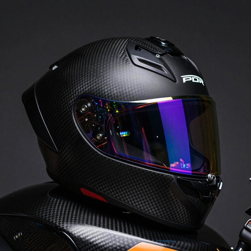 Create a helmet combining a sleek motorcycle racing design with aerodynamic curves, matte black carbon fiber shell, visible ventilation channels, and a tinted visor reflecting a neon cityscape at night, capturing speed and intensity.