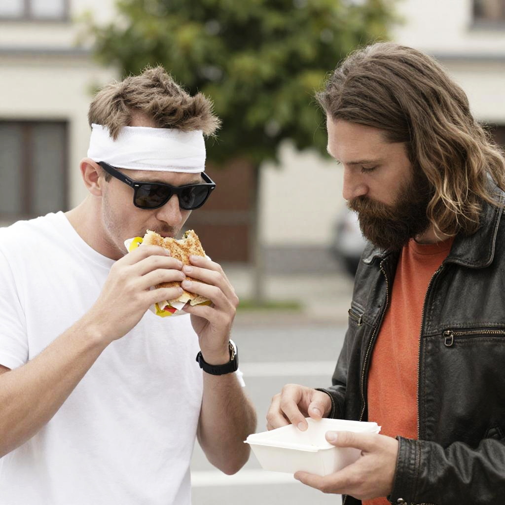 Photograph of two men outdoors. Man on left has bandage on forehead, sunglasses, white shirt, eating sandwich from paper container. Man on right with long brown hair, beard, leather jacket, orange shirt, holding container. Both focus on sandwich. Blurred green tree and building in background.