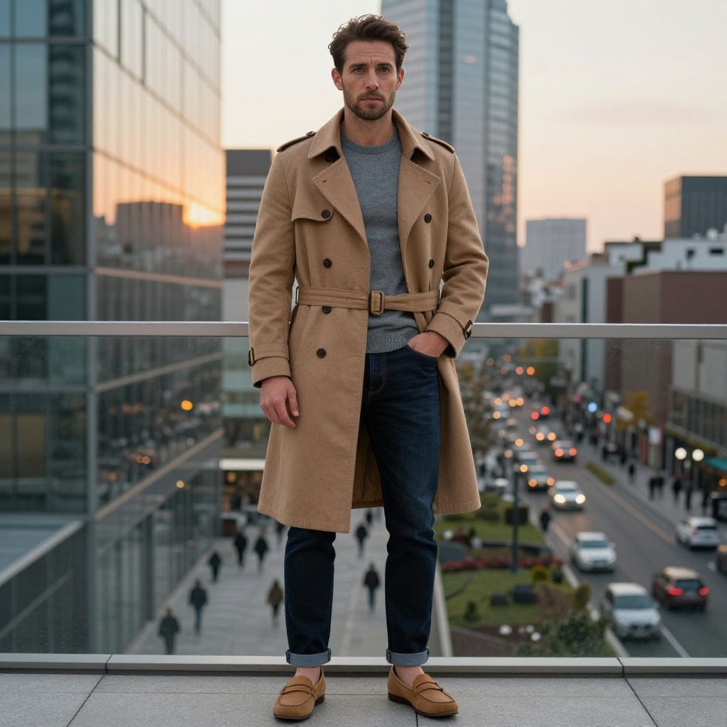 A man, camel trench coat, belted waist, soft cashmere blend, dark blue skinny jeans, raw hem, tan leather loafers, fitted gray crew neck sweater, glass facades reflecting sunset, bustling street below, rooftop gardens with city views, cinematic film style, confident expression. Man has masculine face and piercing eyes