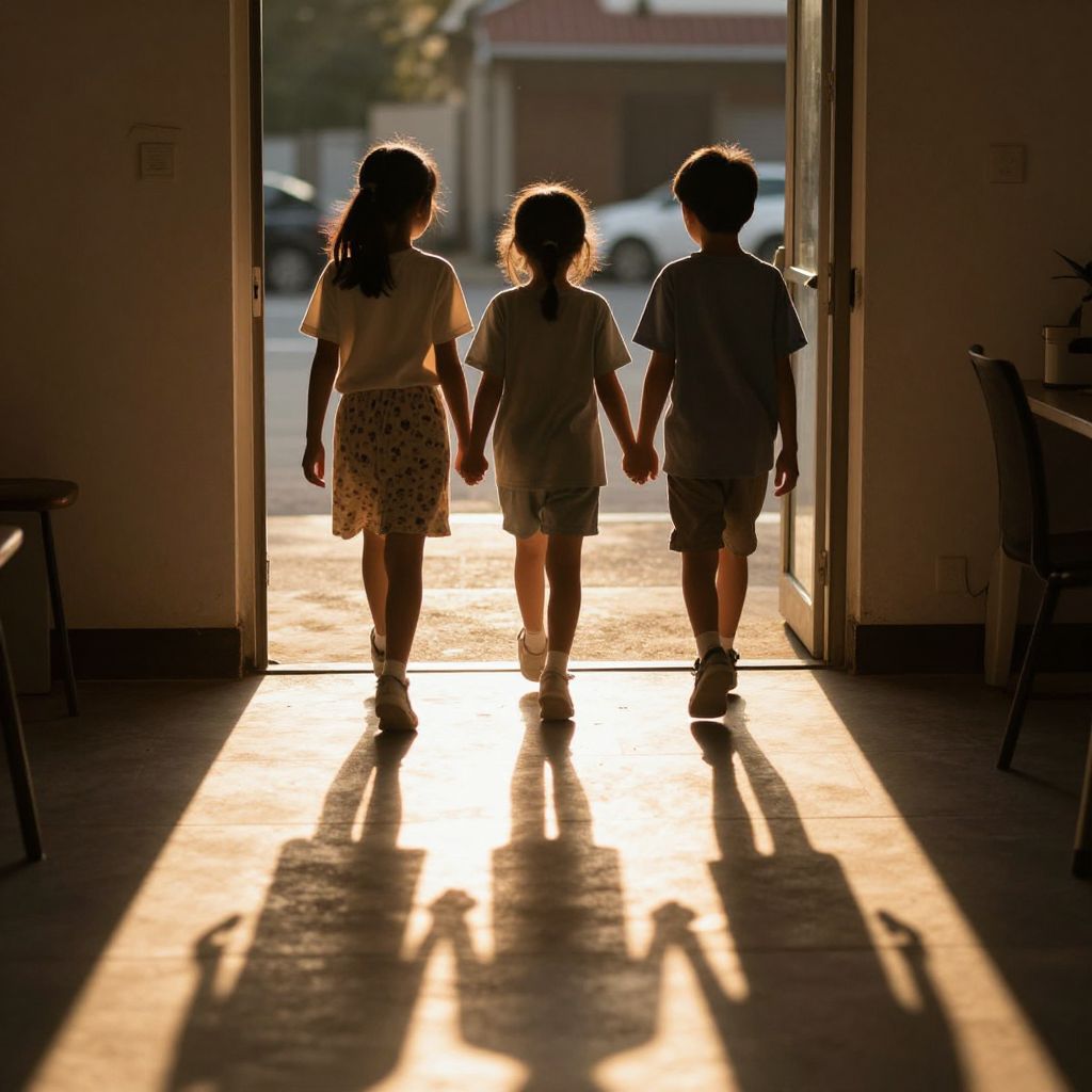 Three children walk hand-in-hand through a doorway, casting elongated shadows on the floor as they step into the warm, golden light of the setting sun.