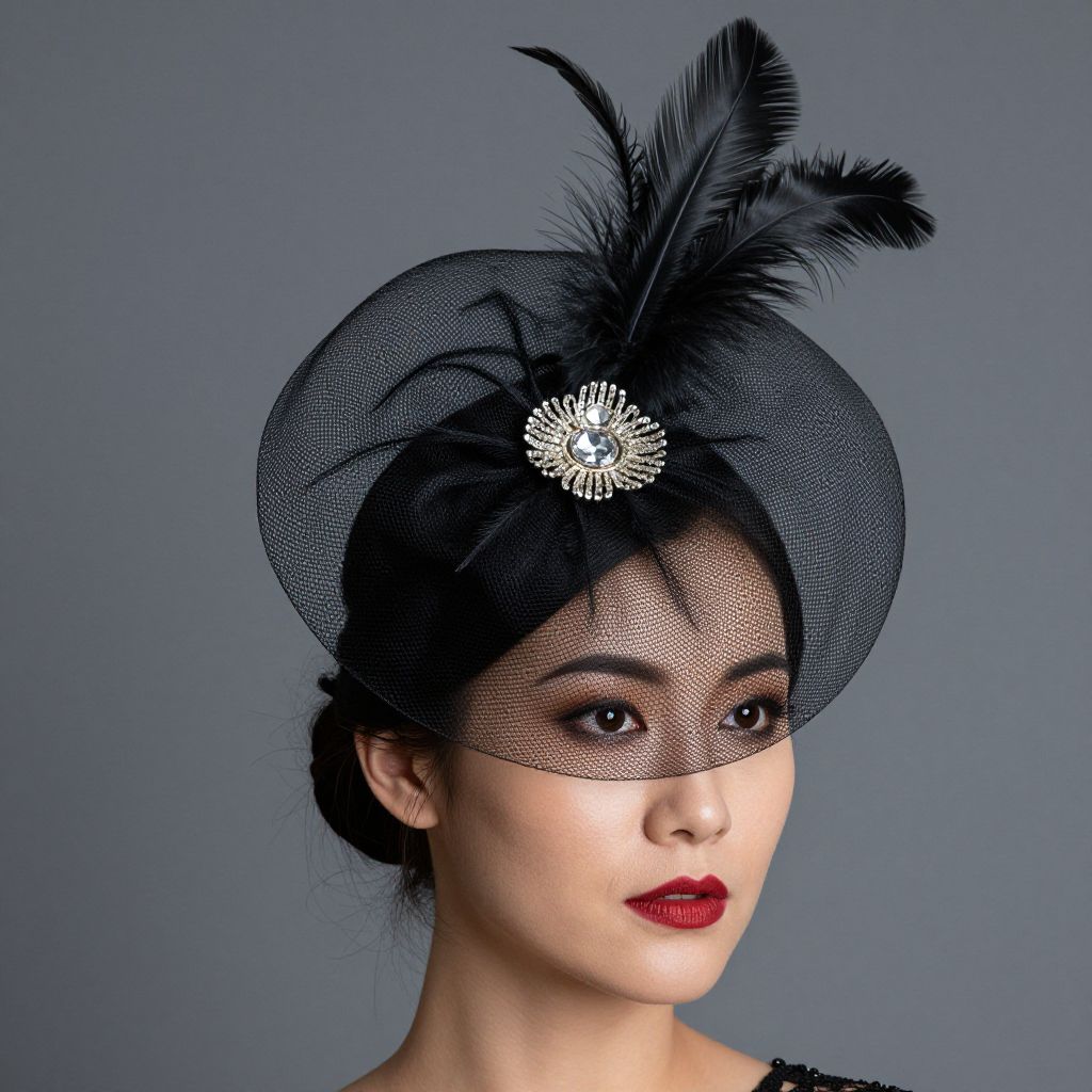 Photograph of a fair-skinned woman with red lipstick, wearing a black, sheer, wide-brimmed hat adorned with black feathers and a sparkling brooch. Her dark hair is neatly pulled back, and she has dramatic, dark eye makeup. The background is a solid, muted gray, highlighting the elegance of her vintage-inspired attire. The texture of the hat is delicate and mesh-like, contrasting with her smooth skin and bold lip color. The image focuses on her head and shoulders, capturing a timeless, sophisticated style.