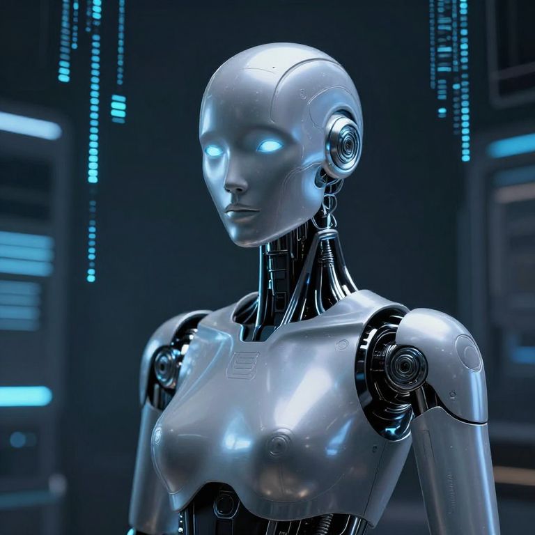 Portrait of an ironsleek android with minimalist features, smooth iron skin with subtle engravings, glowing eyes in a dark room filled with floating data streams, futuristic cybernetic enhancements, moody sci-fi ambiance with blue and silver tones