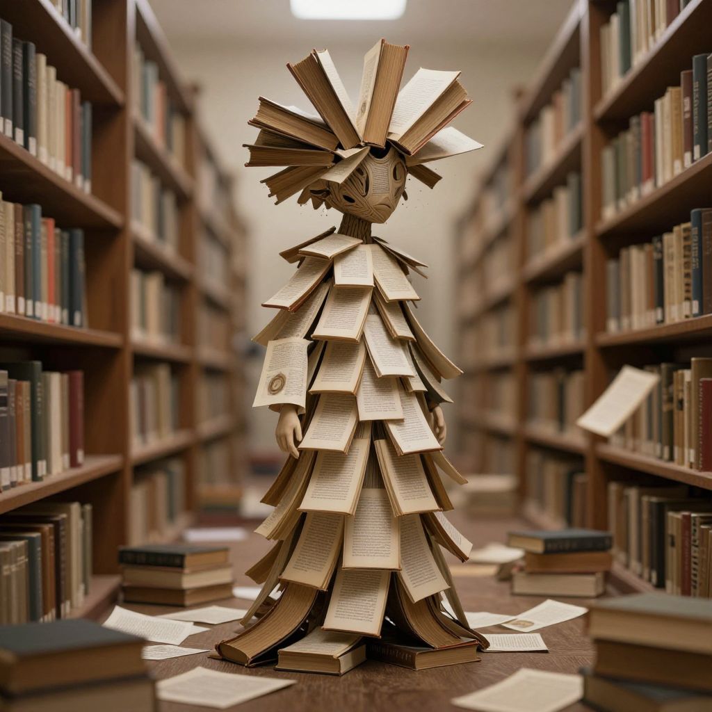 A hauntingly surreal figure emerges from a library, its form composed entirely of cascading pages and books, defying gravity as they swirl around its head like a crown of knowledge, while the ground below is littered with scattered volumes, blurring the line between human and literary essence.
