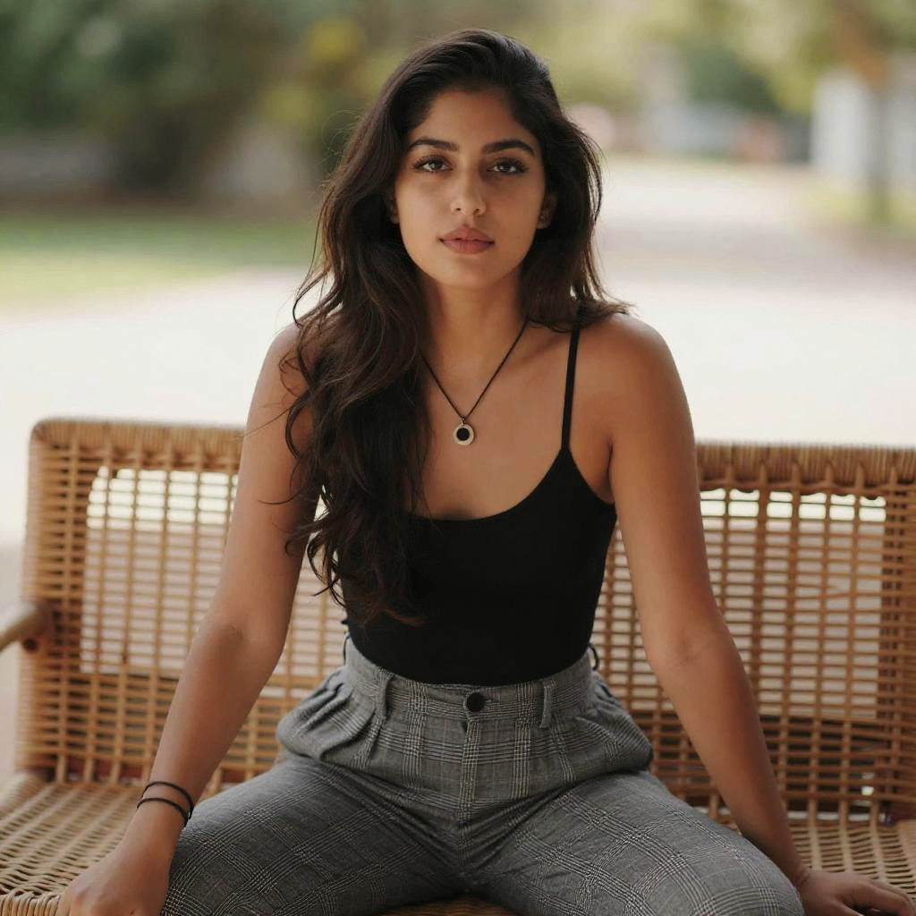 Outdoor editorial portrait of young South Asian woman with curly dark brown hair and warm medium skin tone, casual pose, gentle smile, gaze slightly off-camera. Bright natural daylight creates soft, clean shadows across the face and shoulders, with realistic skin texture and subtle highlights. Set against sunlit urban rooftop with contemporary glass railing and skyline view. Color photo with bright natural color palette, modern minimalist composition, architectural urban surroundings, understated HDR effect, no text or logos.