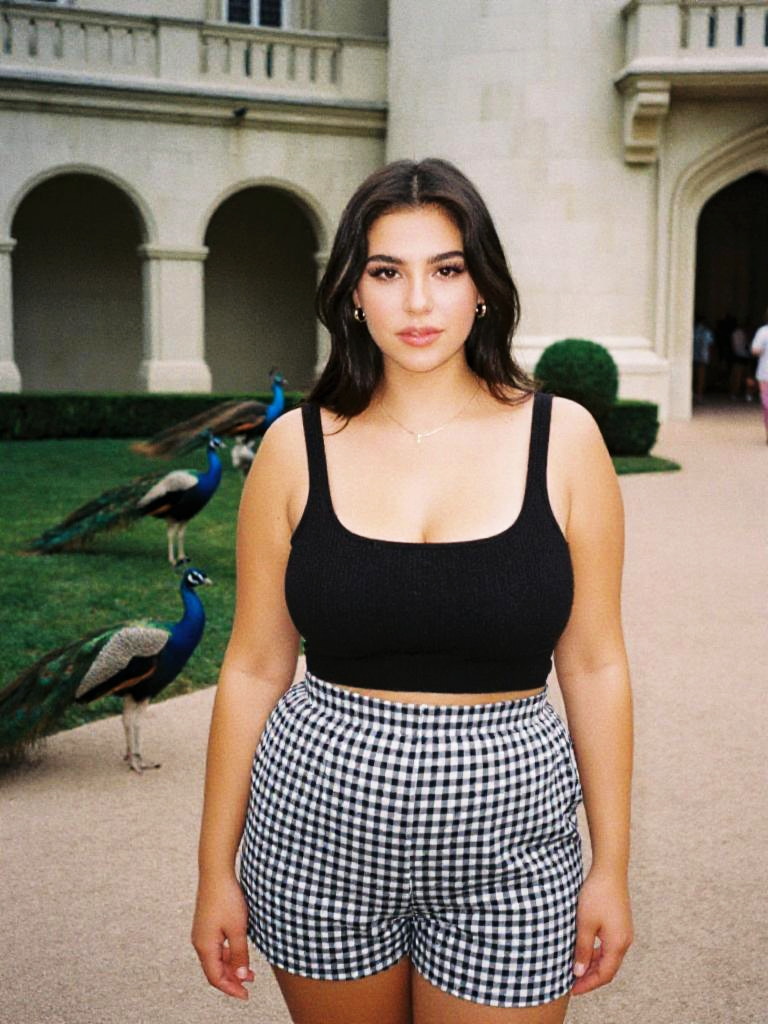 Photograph of a young woman with medium-length brown hair, wearing a black tank top and black-and-white checkered shorts, standing in a dimly