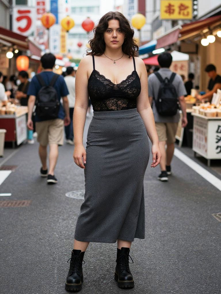 A Stocky woman, styled in anscochrome analog film, wearing a black and white gingham romper layered over a black crop top, standing on a bustling subway station platform during rush hour. Sexy. Pretty face and beаutiful eyes. Big breasts