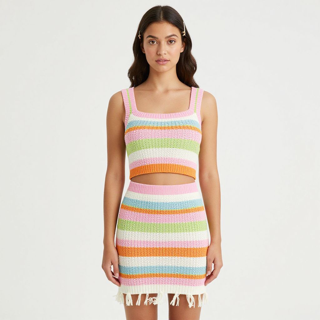 "Woman, casual chic, sleeveless knit crop top with matching skirt, pastel horizontal stripes in shades of pink, green, white, and orange, square neckline, knee-length skirt with fringe hem, simple hair clip, white background.. Sexy. Pretty face and beаutiful eyes. Big breasts."